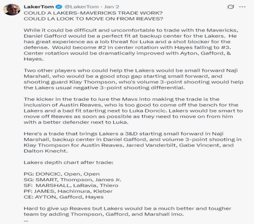 1月1日时CBS记者萨姆-奎因这样建议:放弃这个赛季吧,休赛期手握5500万的薪金空间,用这笔钱来补强防守与运动能力,然后还可以评估交易市场,今夏湖人有三个可以交易的首轮签足够打包换来一个球星,或者拆分增加阵容深度,重点是弥补东契奇防守端的不足。