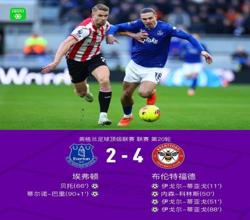 北京时间1月4日,英格兰足球超级联赛第20轮,埃弗顿坐镇主场迎战布伦特福德。比赛中,布伦特福德前锋伊戈尔-蒂亚戈完成帽子戏法,内森-科林斯建功。埃弗顿方面,格拉利什助攻双响,贝托、蒂尔诺-巴里破门。最终全场战罢,埃弗顿以2比4不敌布伦特福德。