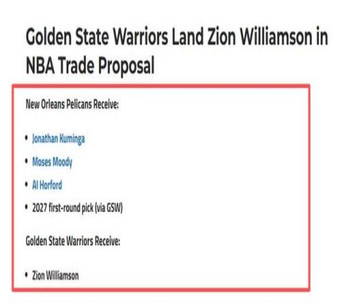 北京时间1月18日,NBA交易市场的热度被一则重磅传闻推向顶点。据最新下家赔率显示,金州勇士以绝对优势成为锡安·威廉姆森的头号潜在下家,力压公牛、热火等竞争对手。随后美记James Piercey抛出一份4换1交易方案:勇士送出库明加、穆迪、霍福德及2027年首轮签,从鹈鹕换来这位天赋异禀却饱受伤病困扰的全明星内线。在勇士全力争冠的背景下,这笔看似双赢的交易,究竟是冲击总冠军的神来之笔,还是赌上未来的冒险豪赌?