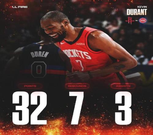 本场比赛赛后,火箭球星凯文-杜兰特接受了媒体采访。在最近两天,火箭队在客场背靠背对阵了76人和活塞,37岁的杜兰特在这两场比赛中先后出战44分02秒和40分40秒。赛后谈到背靠背和球队保障团队时,杜兰特说道:“我只是享受着每天清晨醒来奔赴赛场的这份感觉。”