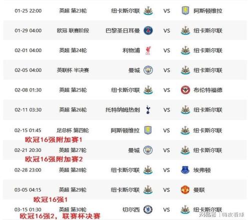 不仅如此,这段赛程当中,还没有包括可能出现的欧冠16强附加赛的两回合,以及16强的两回合。由于纽卡斯尔欧冠末轮跟同积13分的巴黎圣日耳曼碰面,落入附加赛的机会是相当高的。如果全部参加的话,加上联赛杯半决赛淘汰曼城,上述的赛程中,还要加上4场欧冠和1场联赛杯决赛,难度将大大增加,实在很难用什么文字来描述。