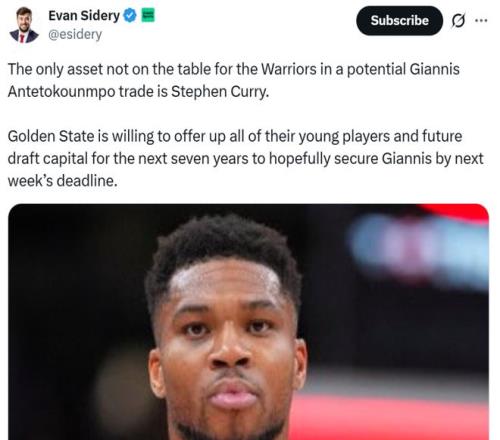 勇士队的确正在全力追求字母哥,根据名记Evan Sidery报道,在与雄鹿队的交易讨论中,勇士队已经明确表态,除了库里是非卖品之外,其余球员均可以纳入交易方案,包括未来七年的所有选秀权资产。