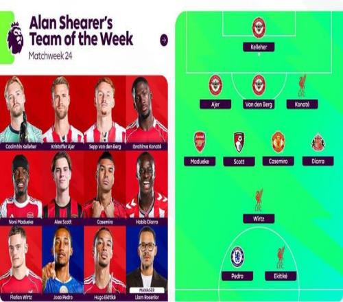 北京时间2月4日凌晨,英超官方晒出了阿兰-希勒评选的英超第24轮最佳阵容,其中,科纳特、马杜埃凯、维尔茨、卡塞米罗、若昂-佩德罗和埃基蒂克等人在列。